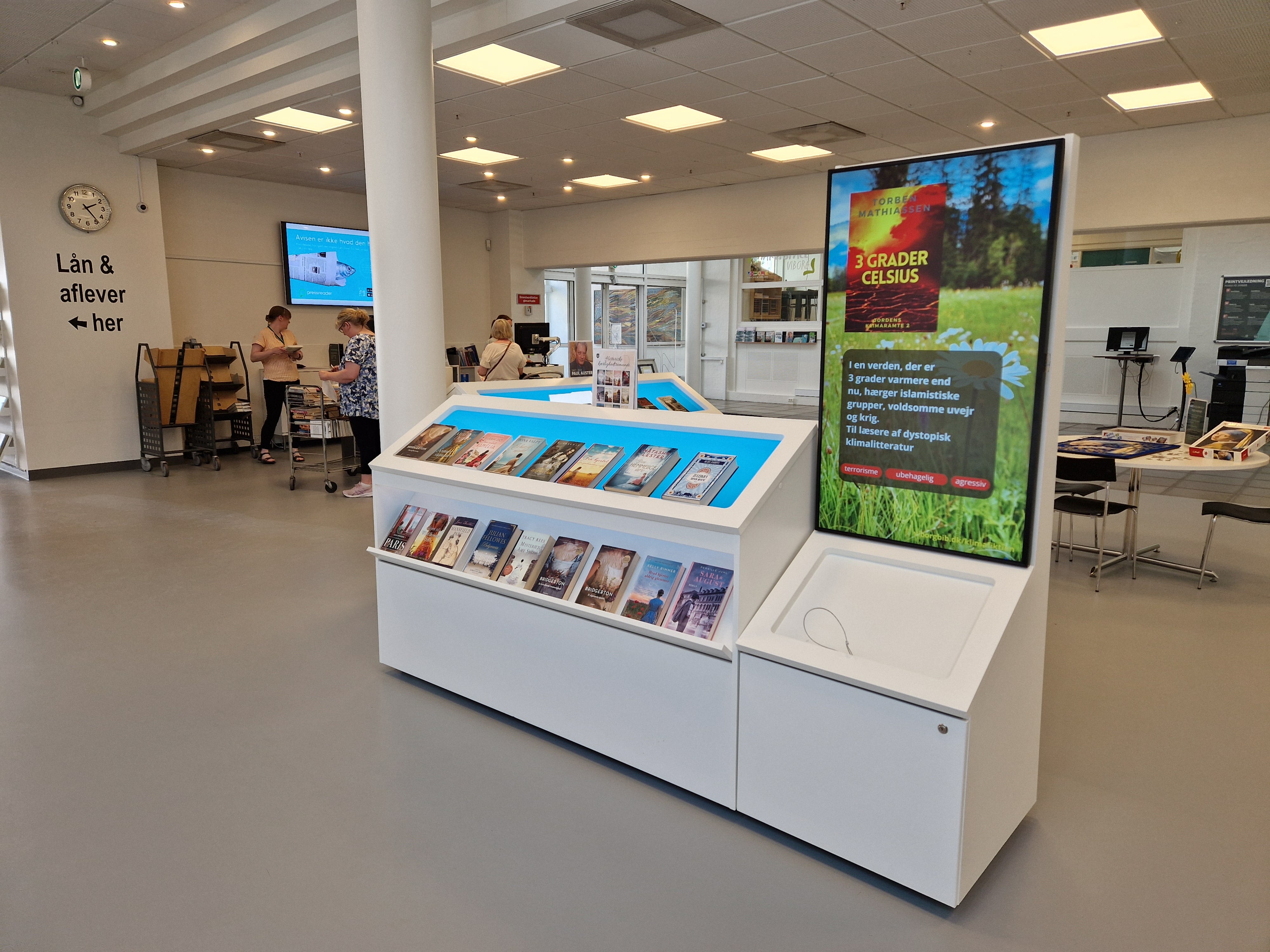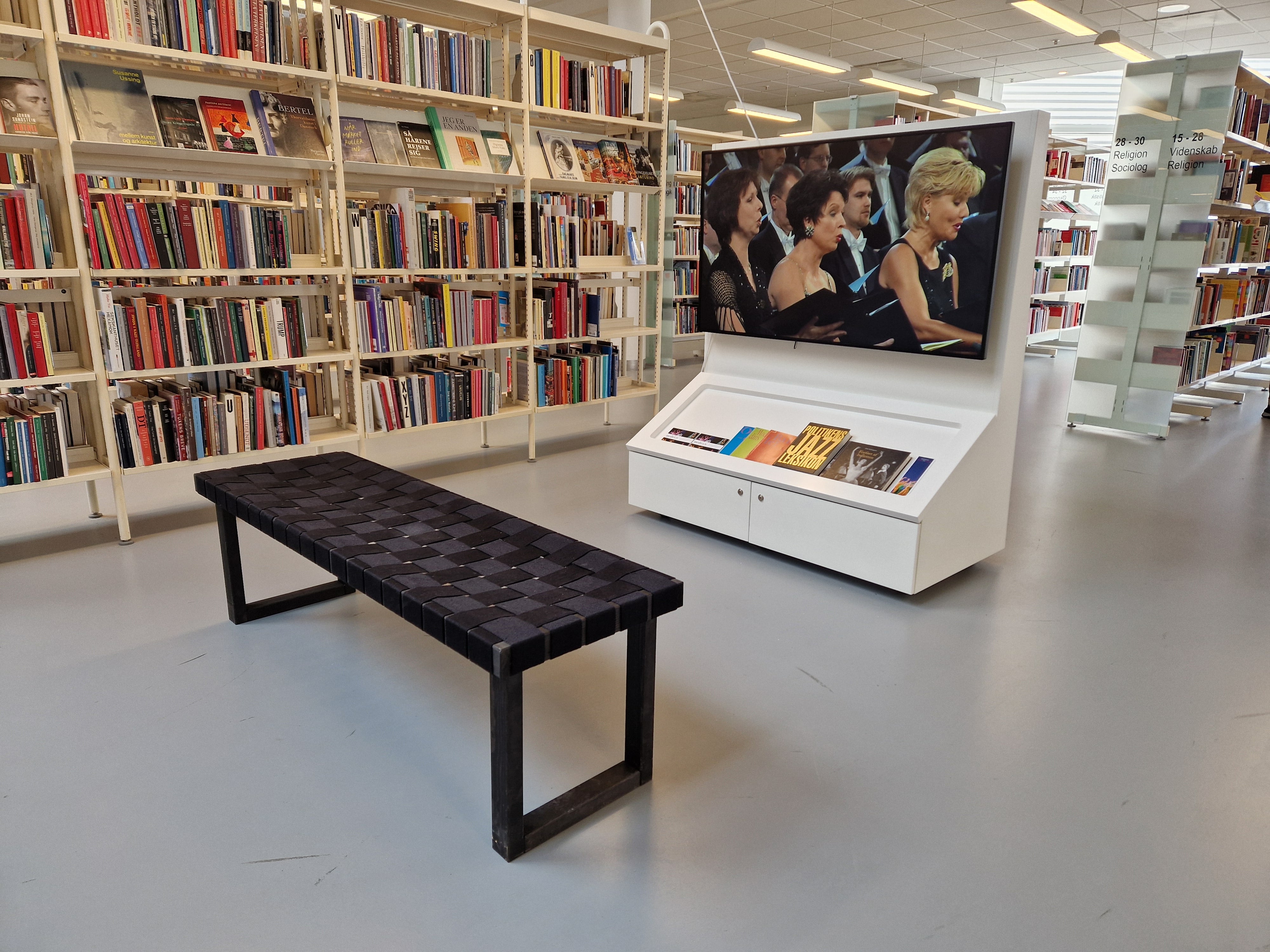 Vi har designet og leveret disse udstillingsmøbler. De er en kæmpe succes! Bøgerne lyser op som perfekt eksponering af temaer som rejser, krimier, køn eller ungdomsbøger med tilhørende film som kører på fladskærmen og iPad til videre søgning. Bøgerne belyses af LED igennem farven eller printet på akryltoppladen som kan udskiftes f.eks. med print af en bøgeskov eller en anden farve som passer til temaet.