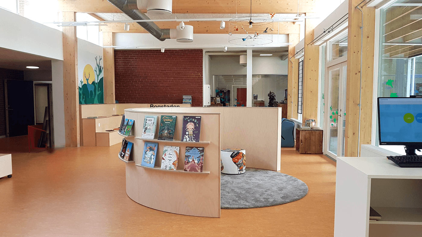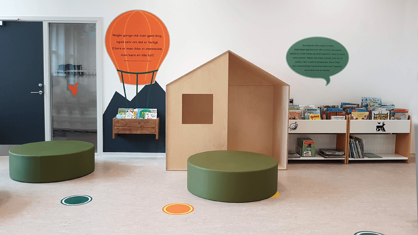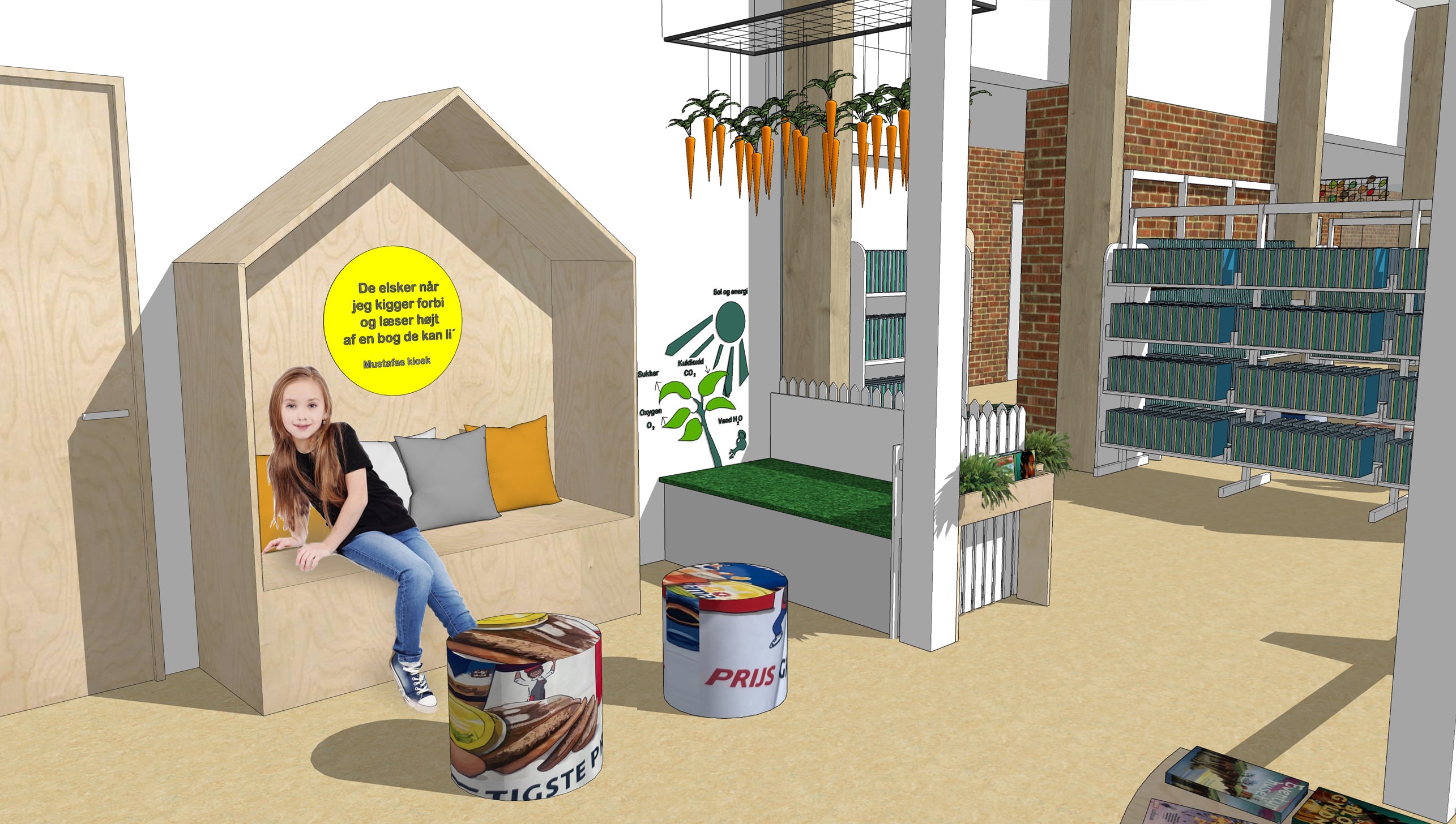 Hvor afleverer man bøger, hvordan får vi skabt oversigt over hele arealet samtidig med, at der skal være en masse små rum, høje reoler og huler, hvordan får vi 25 børn samlet til fælles fokus uden forstyrrelse. Kan der være legezoner uden at forstyrre andre. Kan vi navngive de forskellige rum kreativt med et tvist. Hvordan guides man rundt i de mange rum uden ordinær skiltning. Vi synes det er så skønt at kunne løse disse udfordringer og samtidig skabe en helhed som hænger sammen, med alle krav indarbejdet. Det var en drømme udfordring for os.